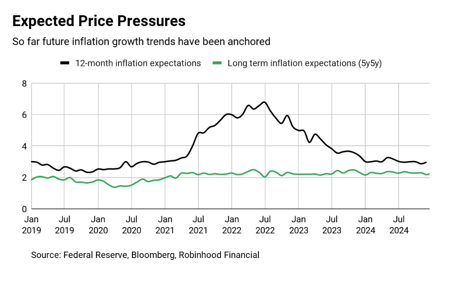 So far, the Fed has done a good job anchoring expectations. Short-term and long-term inflation expectations have remained relatively stable (see below), outside of the spike we saw in 2022 and early 2023. But looking ahead, things like impending tariffs, deregulation, and fiscal spending could cause expectations to drift higher. If that happens, managing inflation will become far more challenging for the Fed.