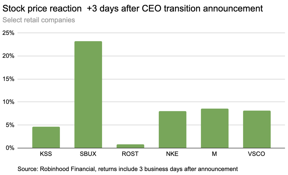 So it may be no surprise that this year alone, we’ve seen CEO changes at some of the biggest names in US retail: Kohl’s, Starbucks, Ross Stores, Nike, Macy’s and Victoria Secret’s, to name a few. This has also started to spread into other industries—to companies like Intel and Stellantis, just in the past week.