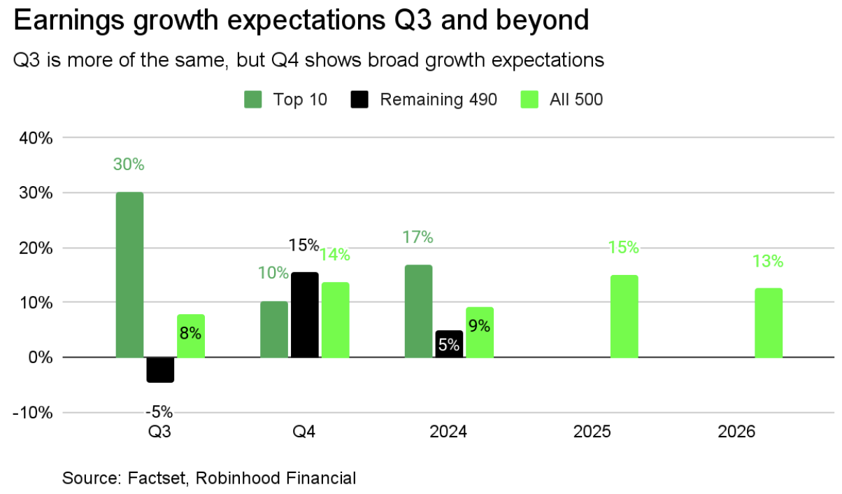 In investing, expectations are everything. So it’s important to know where they are—especially at these valuation levels. For the 3rd quarter, the top 10 largest companies by market cap are projected to deliver year-over-year earnings growth of 30%. Excluding them, the blended earnings growth rate for the remaining 490 S&P 500 companies is expected to be -4.5% for Q3 2024. So it should be no surprise that, at the sector level, tech is expected to be the biggest driver of earnings growth, while energy is set to be a drag (-1.6% growth).