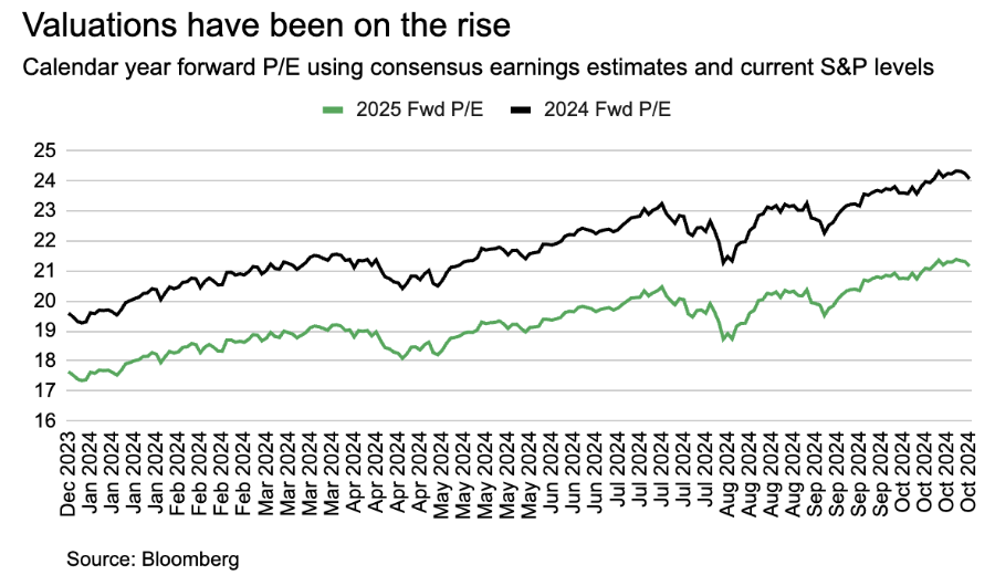 Full-year 2024 earnings growth currently sits at 9.1%, with analysts hoping for a resurgence below the top 10 in Q4. In fact, the expected earnings growth for the top 10 in Q4 is 10.4% vs 15.4% for the remaining 490. This would be the first time in at least 6 quarters that earnings growth is expected to see broad-based contributions vs. the concentrations.