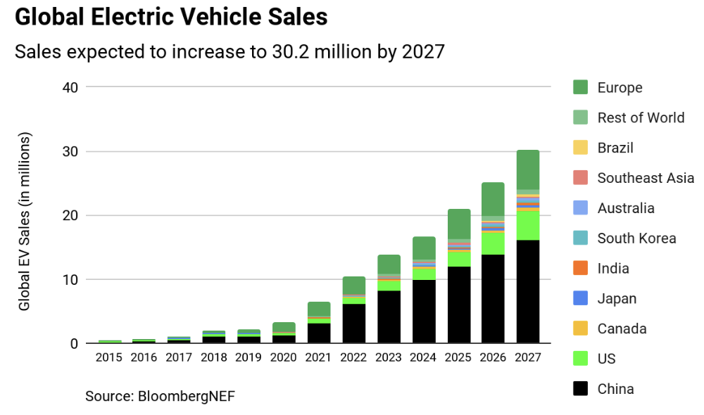 Around 2021, hype on electric vehicles started to really pick up steam. EV sales doubled as nations and select US states implemented incentives to promote net carbon goals while advances in technology made vehicles generally more affordable. Expectations might still be quite steep. For example, according to BloombergNEF, global electric vehicle sales are set to reach 30 million by 2027, well above the 14 million sold in 2023. That said, it does reflect a 21% annual growth rate, vs. the 61% growth rate between 2020 and 2023.