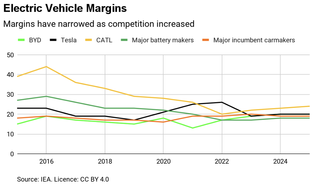 Meanwhile from an investor’s perspective, increased competition has started to shift profitability. Advances in battery technology may have initially helped early adopters enjoy robust margins. But cheaper batteries have now allowed more companies to enter the market, eroding market share and, with it, margins. According to a report by the International Energy Agency, between mid-2022 and early-2024, Tesla cut the price of its Model Y by $15 to $20k in the United States while battery costs only fell by $3k. In the US, for example, Tesla’s market share of the electric vehicle industry has shrunk from over 60% in 2020 to roughly 45% in 2023.