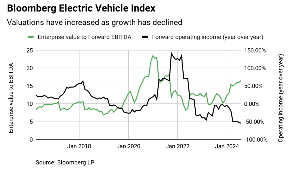Of course, lower margins can raise questions about valuations. In the chart below, the green line shows the price investors of electric vehicle companies are paying per consensus expected EBITDA (earnings before interest, depreciation, and amortization). Let’s refer to EBITDA as operating income. As you can see, investors have been paying over 15 times operating income, even though the growth in operating income is -50% (black line). The last time growth detracted at this pace, investors paid closer to 12 times operating income. No wonder since its peak in 2021, electric vehicles, as represented by the Bloomberg Electric Vehicles Index, have lost 61.0% of their value (as of 7/29/2024).