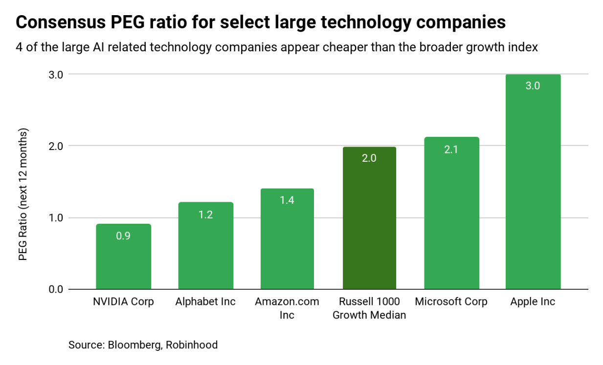 First, valuations. The PEG ratio (the consensus price/earnings relative to expected growth) shows the price investors are paying for expected earnings growth. Typically a ratio less than 1 is considered attractive, while above 1 is expensive. On the surface, among the 5 largest companies, all in tech or comm services, 4 are in the middle to the lower end of their 5-year historical range, with 3 below the PEG of the broader growth index, and a few hovering near the “not expensive” line.