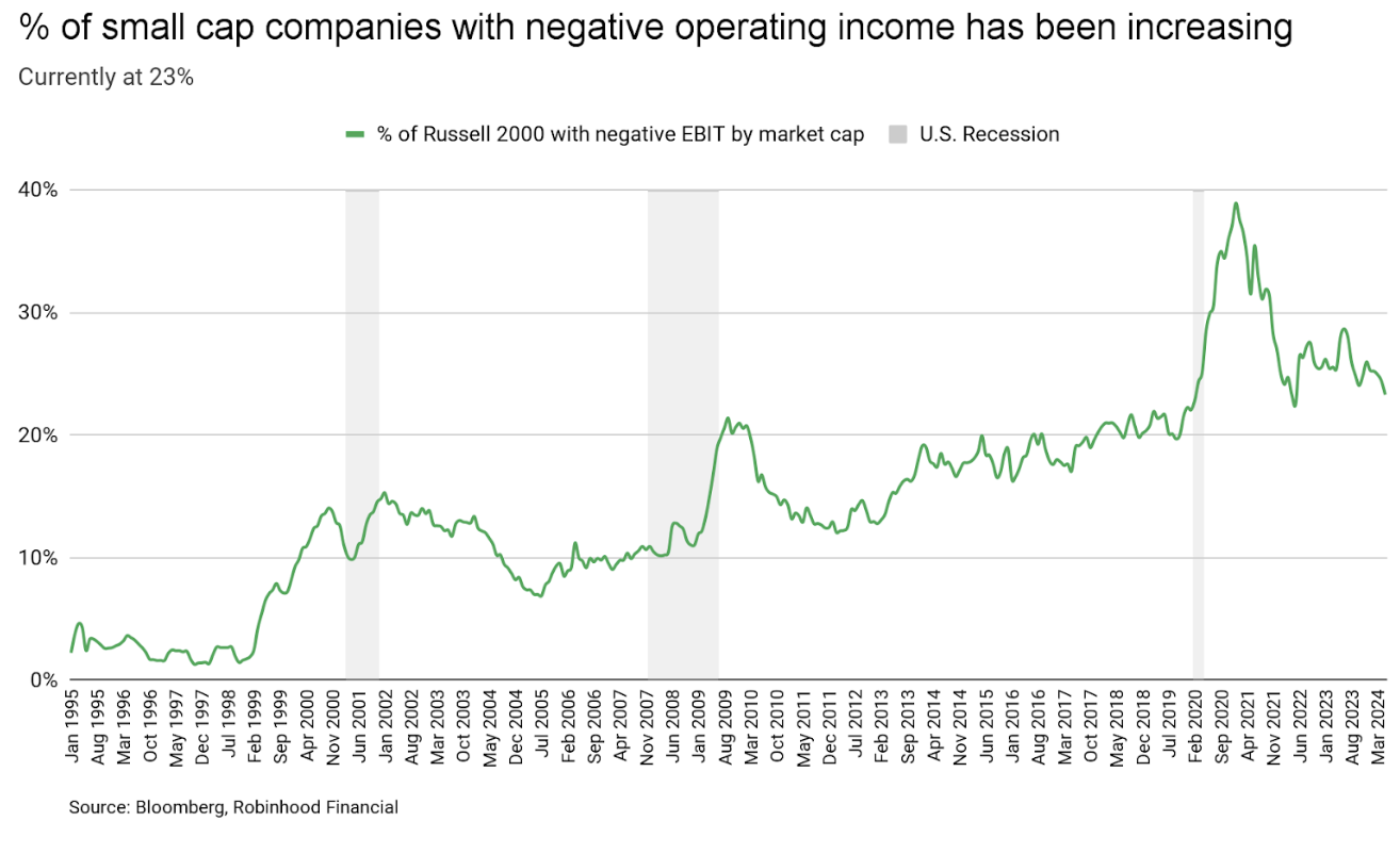 In addition, the number of companies with negative operating income, as defined by earnings before interest and taxes, has been on the rise. This likely happened because of the long period of low rates, allowing negative gross earnings to be okay. In a higher rate environment, this becomes a risk to companies and investors—particularly if their liability costs rise as well.