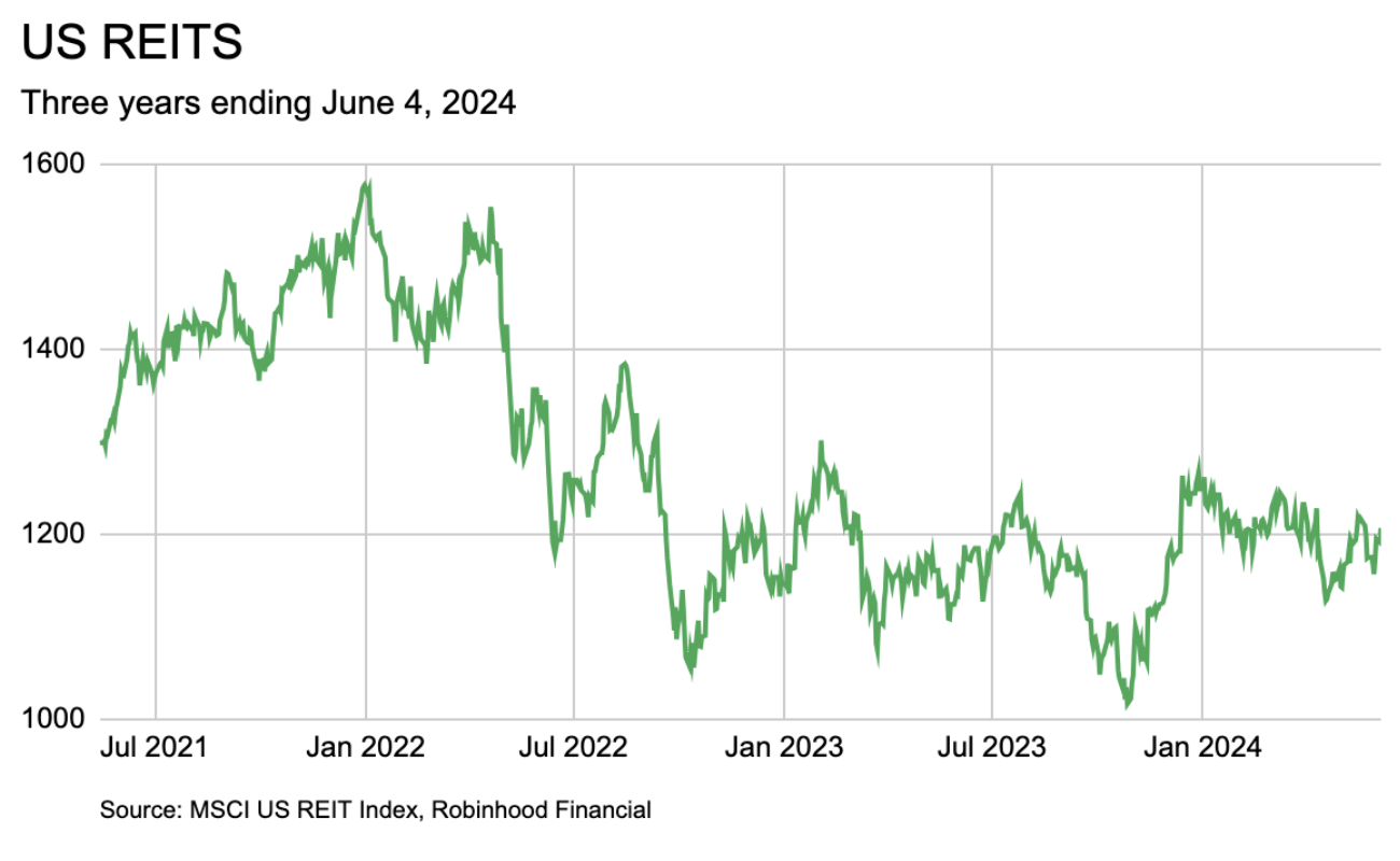 REITs. This stands for real estate investment trusts—and their returns have generally stunk since early 2022.