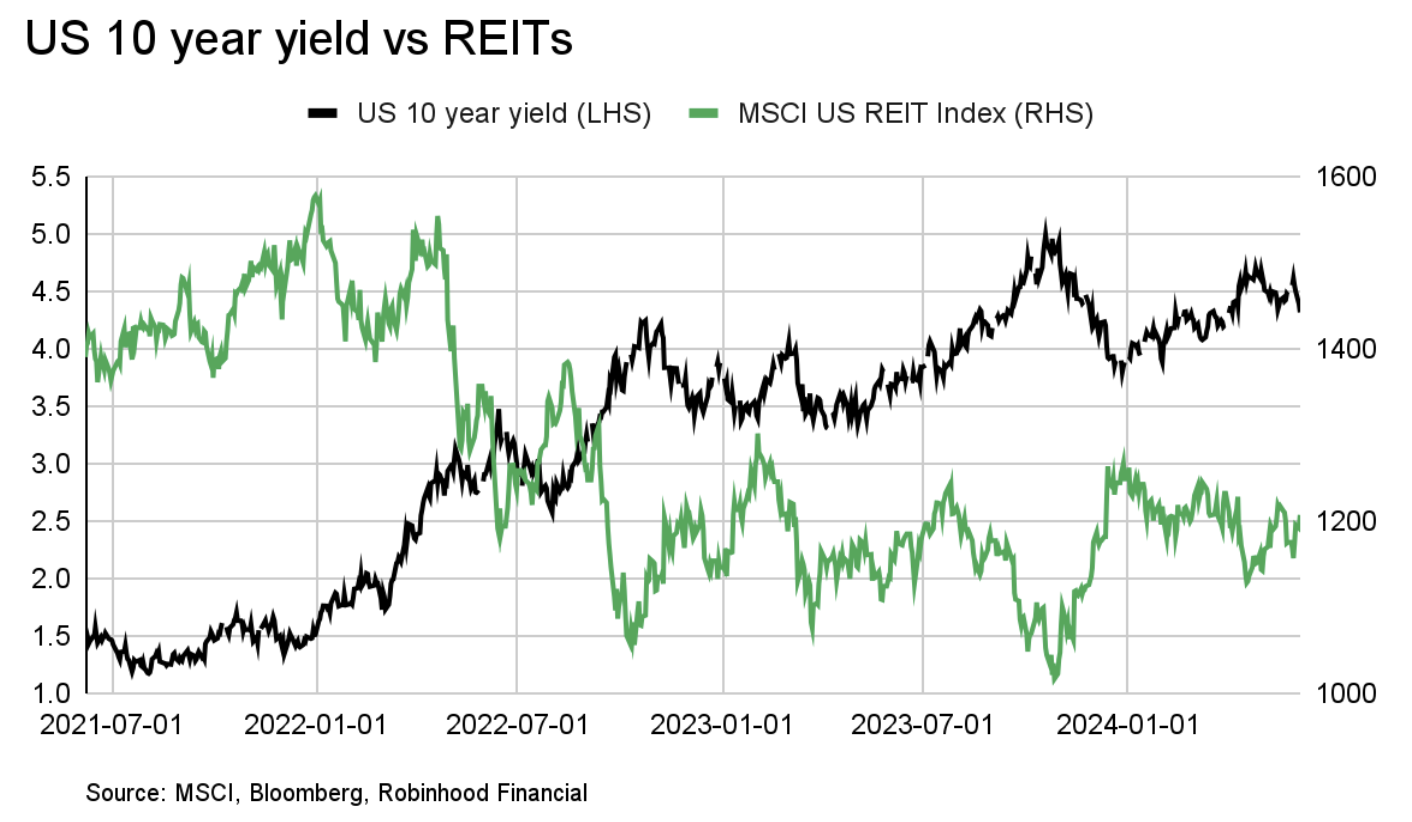 Like real estate, REITs are sensitive to the level and direction of interest rates. When interest rates rise, like they have since 2022 (black line in the chart), this tends to detract from real estate valuations (like the green line), and vice versa.