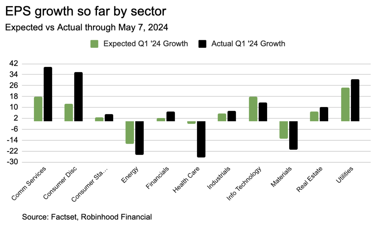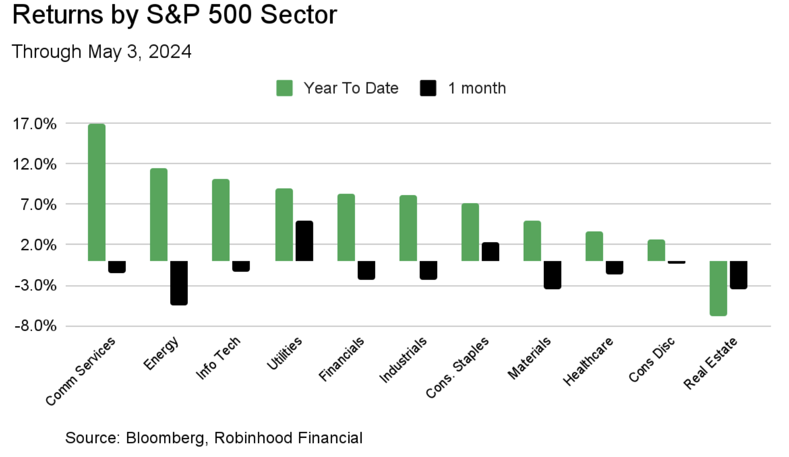 85% of S&P 500 companies have now reported earnings for Q1. When looking at actual vs. expected earnings growth (see chart below), Utilities is in the top three, with only Comm Services and Consumer Discretionary doing better on this measure. So it could be that Utilities ranking well on returns was more about the earnings/guidance disappointments in some tech names vs the strength of utilities alone.