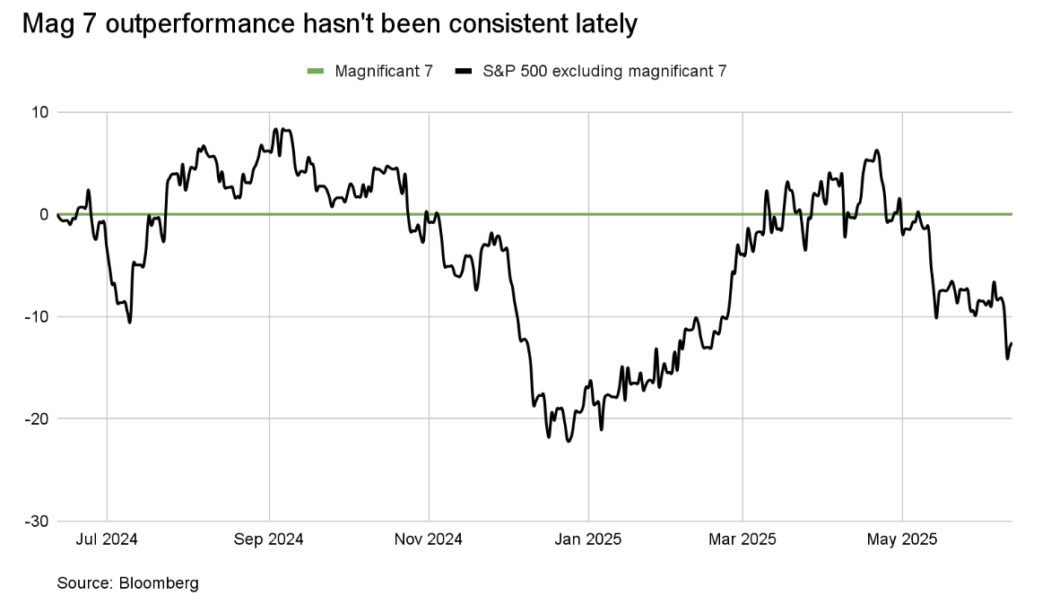 The Magnificent 7 still dominates the broad based indices. But even their performance has been more uneven lately. In fact, as the chart shows, the rest of the S&P 500 has enjoyed healthy pockets of outperformance.